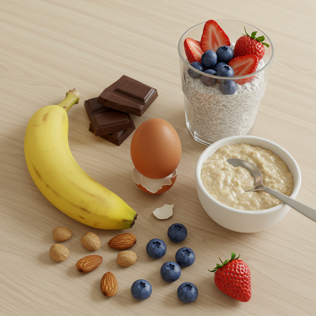 - 재료: 바나나 1개, 아몬드 10알, 우유 또는 두유 200ml, (선택 사항) 치아씨드 1스푼